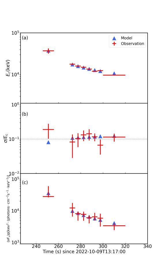 To interpret the evolution features of the emission line, Dr. LIU Jieying and Prof. MAO Jirong from Yunnan Observatories of the Chinese Academy of Sciences, along with Pro. XIONG Shaolin and Dr. ZHANG Yanqiu from the Institute of High Energy Physics of the Chinese Academy of Sciences, proposed a new model. They suggest  that in the subphotospheric region of this gamma-ray burst, electron-positron pair annihilation would generate the original emission lines. As these emission line photons pass through the surrounding high-temperature and high-density medium, they are scattered by the electrons in the medium, losing energy in the process. This results in a reduction of both the energy at the center of the emission line and the total radiation intensity. This process is known as down-Comptonization. By incorporating with the jet dynamics of gamma-ray bursts, the theoretical model of down-Comptonization can systematically explain the temporal evolution of high-energy emission lines in this gamma-ray burst. Simultaneously, physical properties of the internal jet medium, such as its temperature and density, were measured.