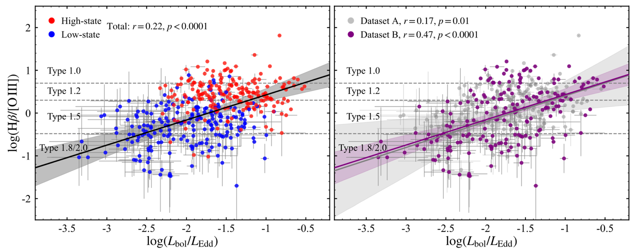 Figure 1: the positive correlation between the spectral type variation of AGN and the Eddington ratio, as well as the analysis results. The left figure defines the bright state and the dim state of AGN with red and blue dots respectively, while the right figure distinguishes the cases of weak spectral type fluctuation (Data Set A) and significant "on-off" dramatic change (Data Set B). Image by LU Kaixing.