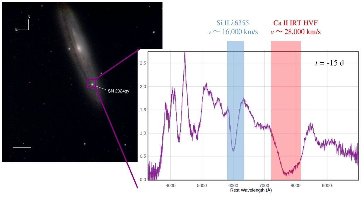 Figure 1: SN 2024gy originated from the host galaxy NGC 4216, and its early-phase spectra (taken 15 days before maximum light) exhibited extremely strong HVFs of calcium. Image by LI.