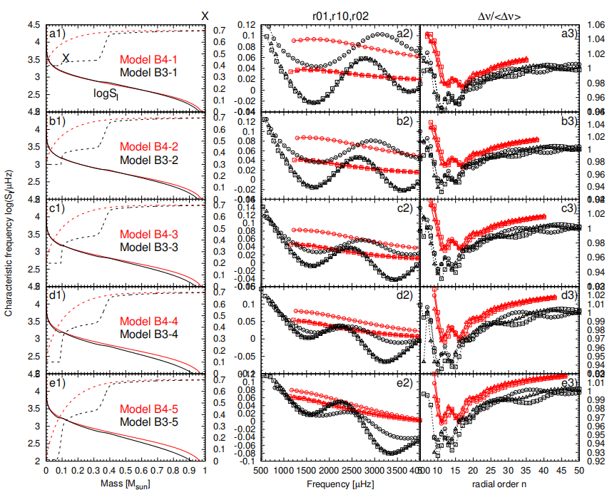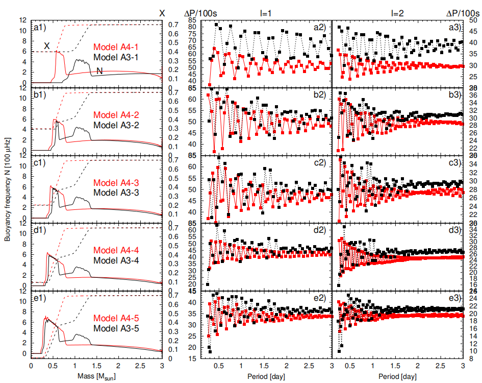 Figure 1: Comparison between the rapid mass loss model (black curve: 4.5 Msun → 3.0 Msun) and the conventional model (red curve: 3.0 Msun) for a typical upper main-sequence star (4.5 solar masses). The left panel shows the distribution characteristics of hydrogen abundance (X, dashed line) and buoyancy frequency (N, solid line); the middle and right panels display the period spacing as a function of period for spherical harmonic degrees l=1 and l=2, respectively. Image by WU.