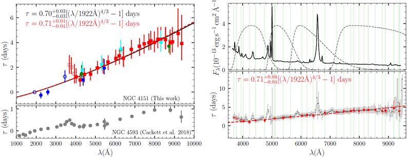 Figure 1. Wavelength-dependent lags. Left: the top panel shows lags for NGC 4151 derived from Swift photometry (blue dots), Lijiang photometry (green dots), synthetic photometry (cyan dots), and spectroscopy (red squares). The black solid line and red dashed line represent the best-fit lag, using all data points and spectroscopy-only data, respectively. Hollow points were excluded from the fits. The bottom panel shows spectroscopic continuum lags of NGC 4593 from Hubble Space Telescope observations. Right: the mean spectrum with Lijiang filter transmission curves (top) and the lags measured at different wavelengths (bottom). The spectrum and transmission have been corrected to the rest frame. Gray dots indicate lags measured from the spectrum at every 3 nm, while the red squares and red dashed line are the same as those in the left panel. The green shaded regions mark the line-free wavelength ranges chosen for the analysis. Image by FENG.