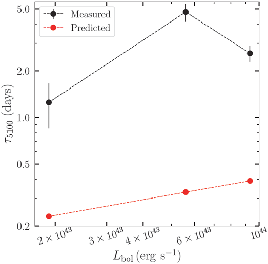 Figure 2. Lag versus luminosity for three campaigns. Black and red represent the measured time delays and the predictions from X-ray reprocessing in a standard thin accretion disk model, respectively. Image by FENG.