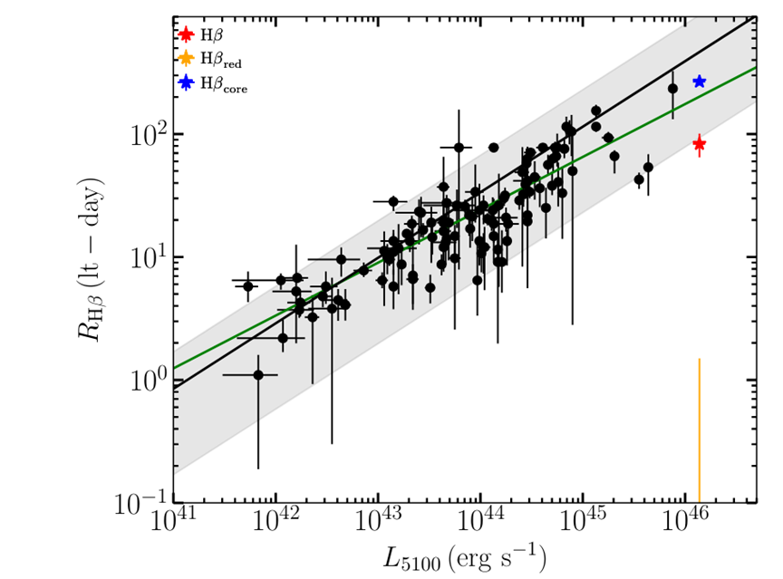 Figure 1. R-L relation. The black line shows the best-fit relation from M. C. Bentz et al. (2013), while the shaded region marks the range between 0.2 and 2 times the radius predicted by this relation. Circles represent data points from the sample of S. Wang & J.-H. Woo (2024), and the green line denotes their best-fit result. Colored stars show our measurements for E1821+643: the red star corresponds to the result from the total Hβ profile, the orange star to the redshifted component, and the blue star to the normal component. Image by LI.